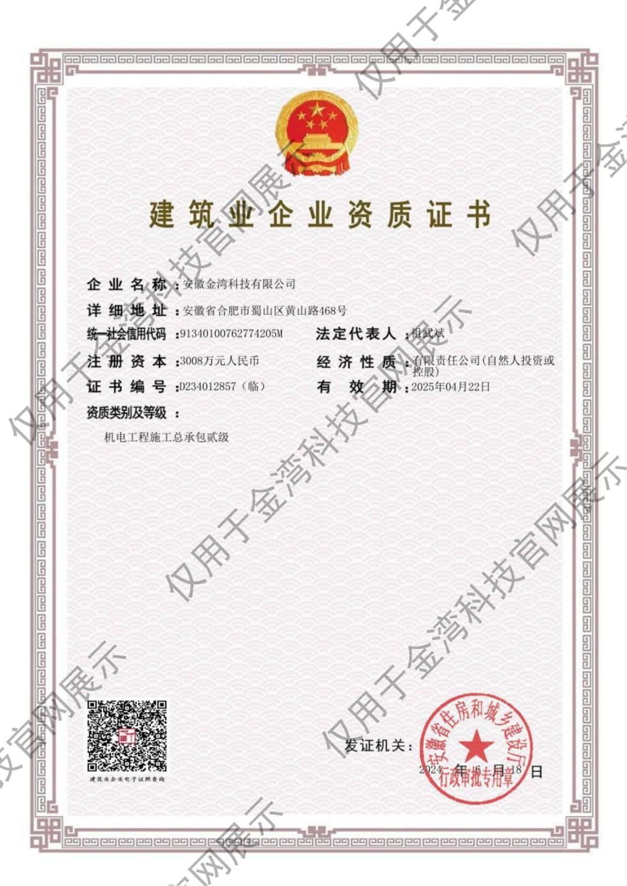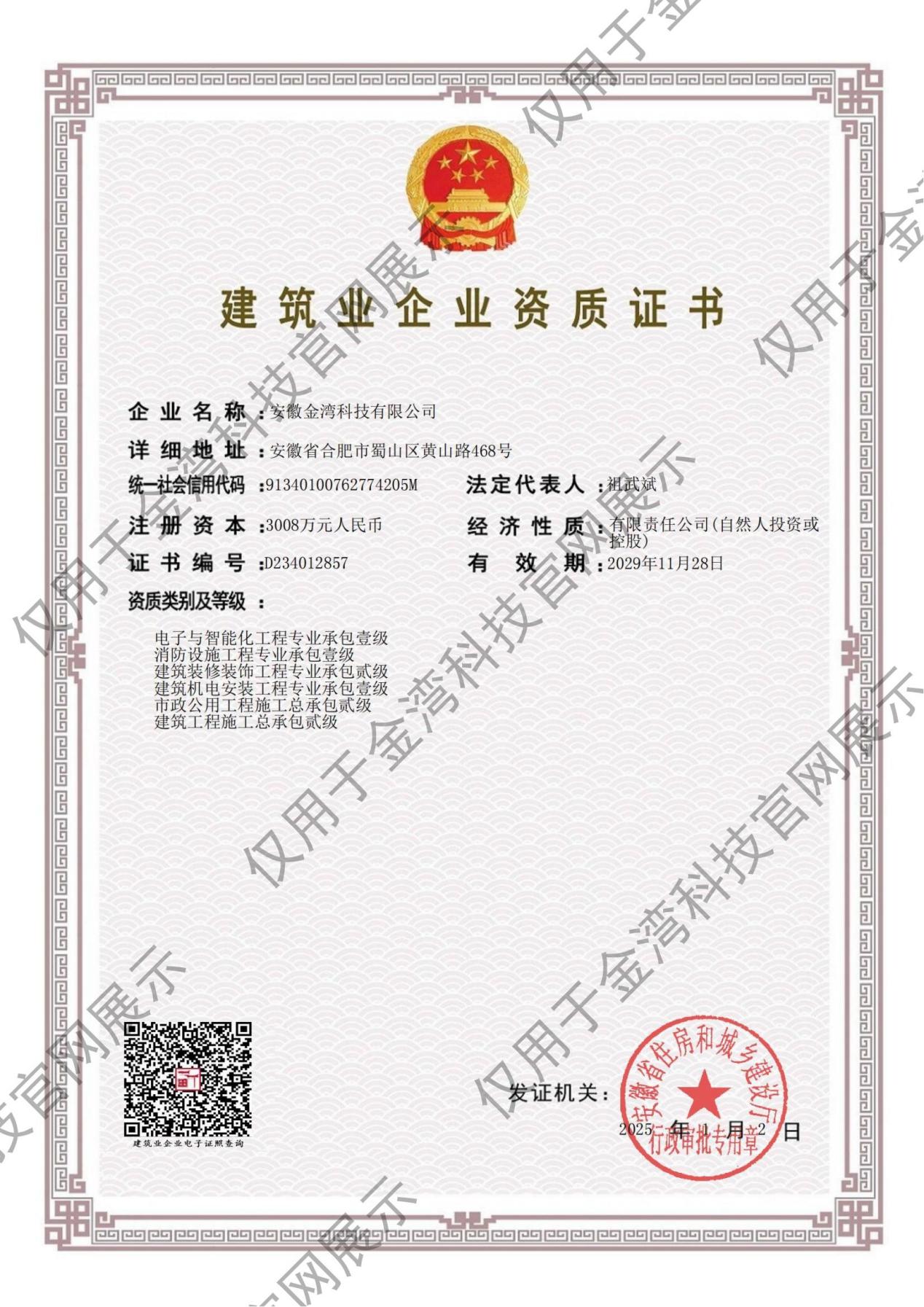 電子與智能化工程專業承包壹級、消防設施工程專業承包壹級、建筑裝修裝飾工程專業承包壹級、建筑工程施工總承包貳級、建筑機電安裝工程專業承包貳級 證書編號:D234012857...