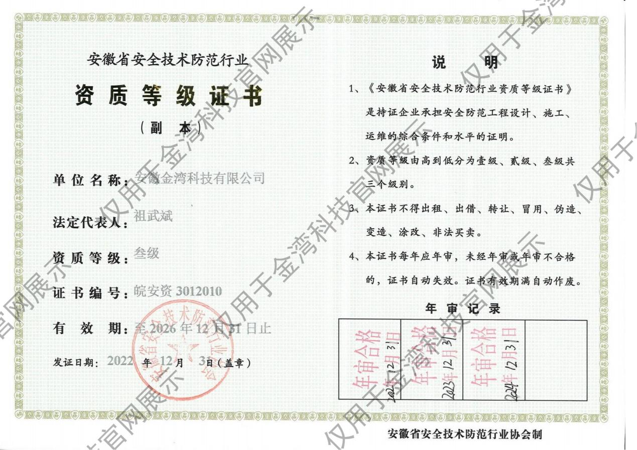 安徽省安全技術防范行業資質等級證書 資質等級:叁級 證書編號:皖安資3012010...