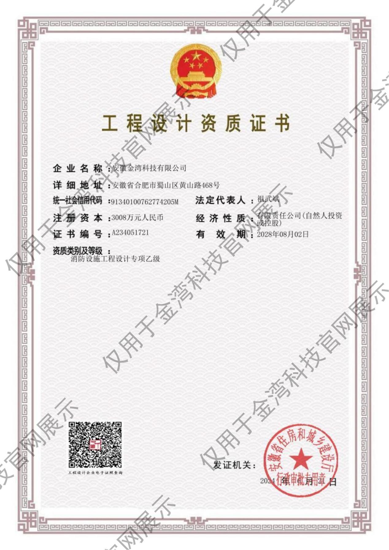 消防設施工程設計專項乙級 工程設計資質證書 證書編號:A234051721...